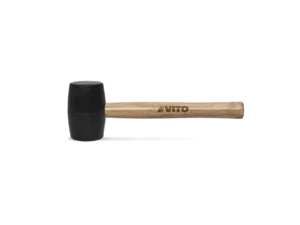 Black rubber mallet with wooden handle and isoprene rubber head.